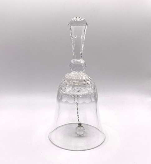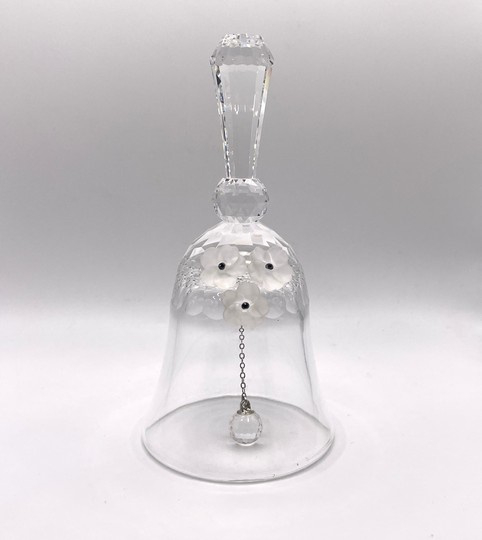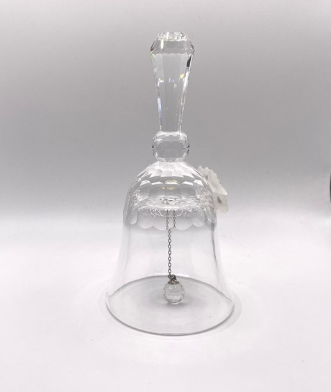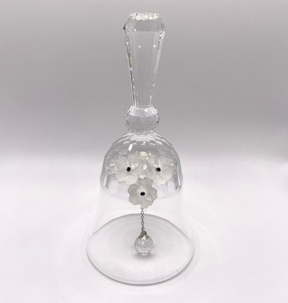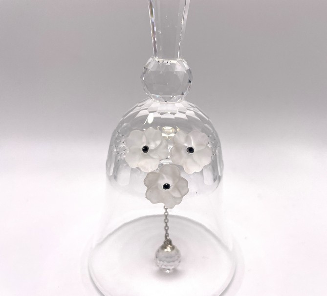 Artikelnummer: 251015Deze elegante Swarovski tafelbel is het grootste model uit de tafelbellen reeks. Deze bel is uitgebracht tussen 1976 en 1988 en is dus een waar vintage object. De bel is gedecoreerd met 3 gematteerde bloemen en maakt een prachtig helder geluid.