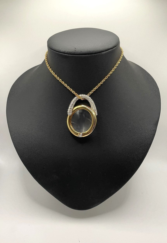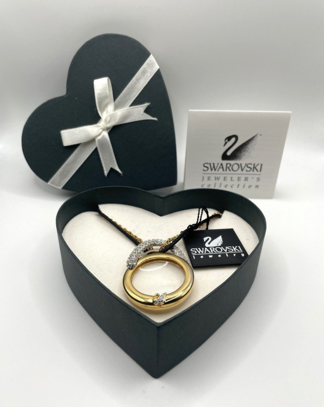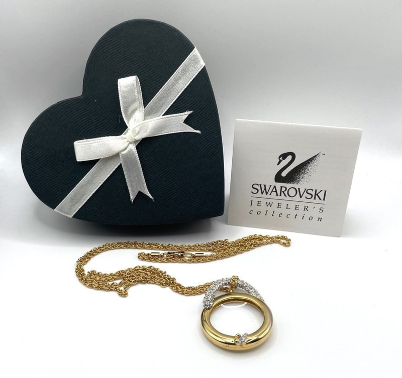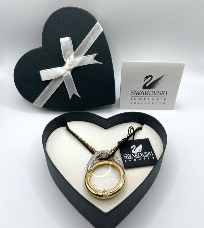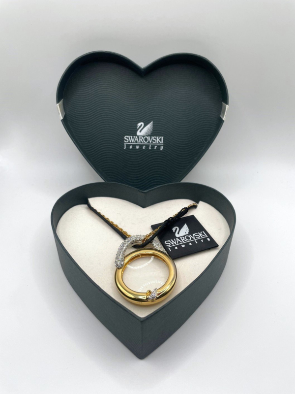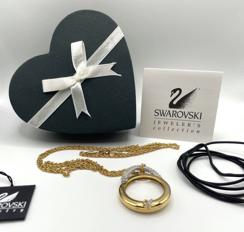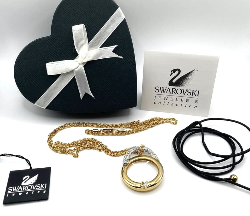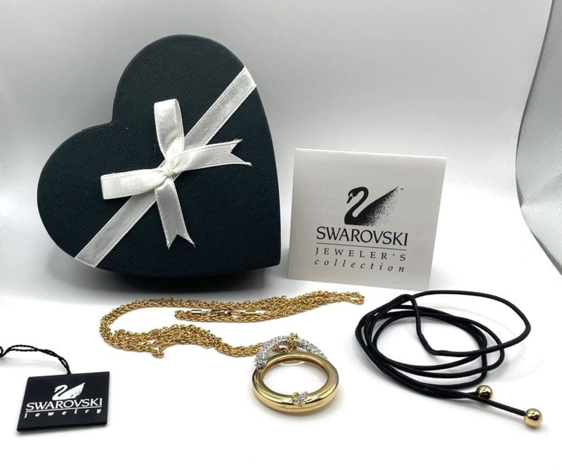 Artikelnummer: G25140Cadeauidee! Prachtige Swarovski ketting met grote hanger. De hanger kan op 2 verschillende manieren gedragen worden: met de goudkleurige ketting of het zwarte touw met goudkleurige balletjes. Het is een lange ketting (89 cm) voor een luxueuze uitstraling. De hanger is bezet met heldere Swarovski kristallen. Compleet met doosje, certificaat en plastic plakaatje.