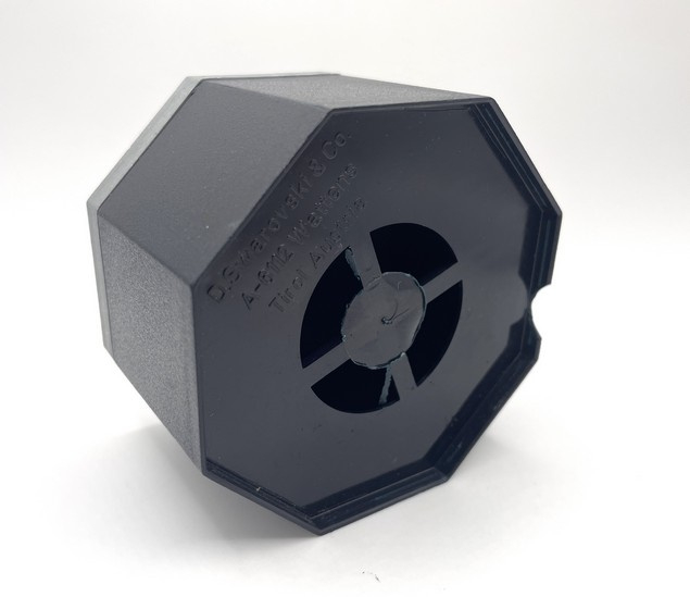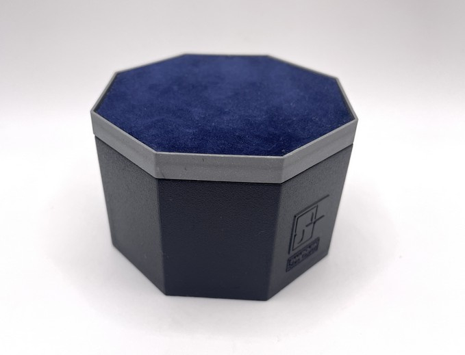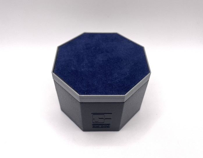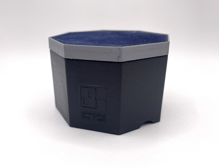Artikelnummer: 251061Octagonaal basement met donkerblauw suede aan de bovenkant. De voor- en achterkant van het basement is gedecoreerd met het vierkante Swarovski logo dat tussen 1976–1988 werd gebruikt. Op de onderkan is de tekst "D. Swarovski & Co. A-6112 Wattens Tirol Austria" te lezen.