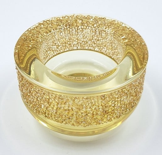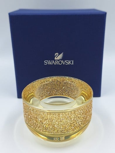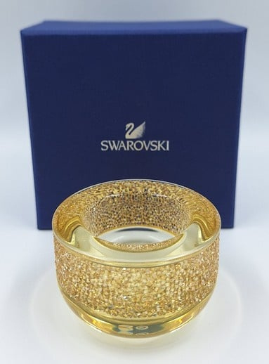 Artikelnummer: G24151Wist je dat Swarovski ook huisaccesoires maakt? Voorbeeld is deze prachtige theelichthouder van goud. De waxinehouder is gedecoreerd met honderden gouden Swarovski kristallen.