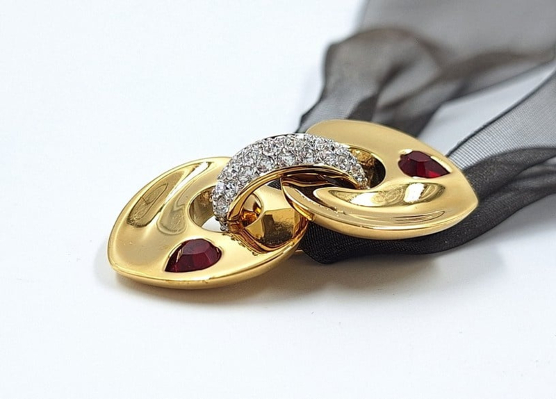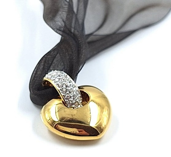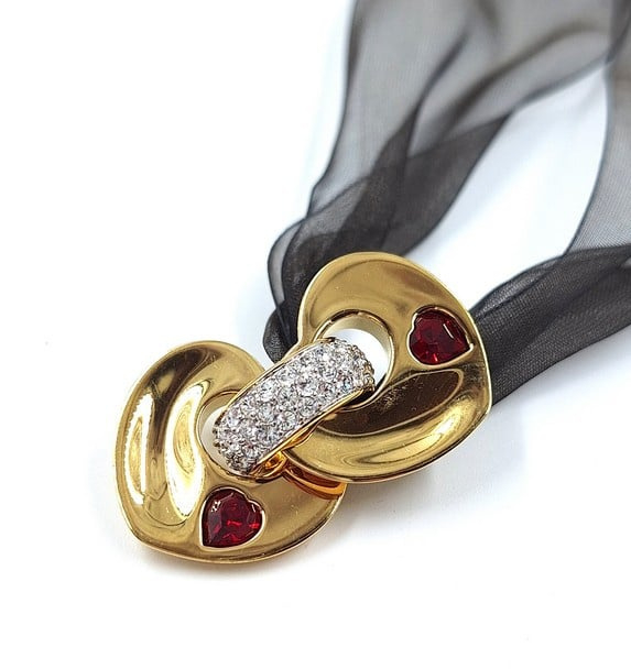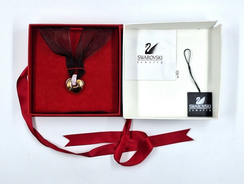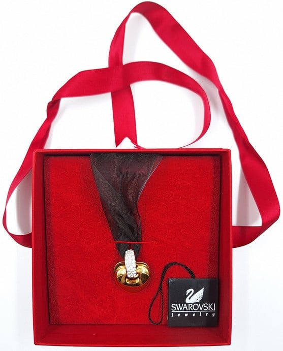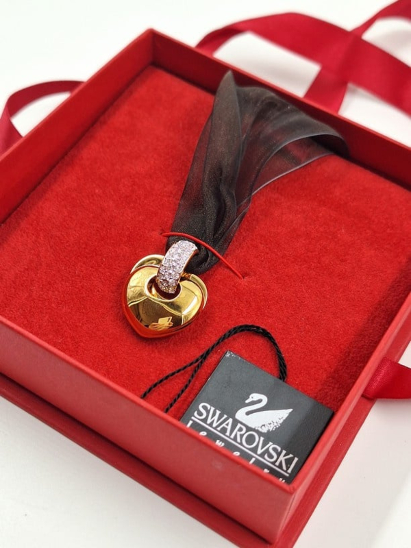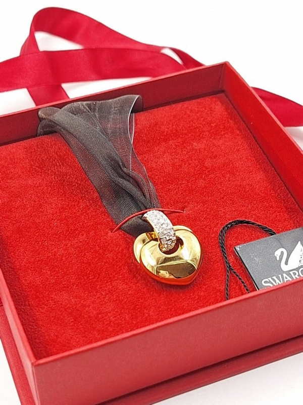 Artikelnummer: G25201Swarovski hanger aan transparant lint. De hanger in de vorm van een hart kan gedragen worden als ketting. De hanger heeft een prachtige gouden kleur en kan opengeklapt worden in 2 hartjes met rode kristallen aan de binnenkant. De hanger zit nog in de originele doos met certificaat.