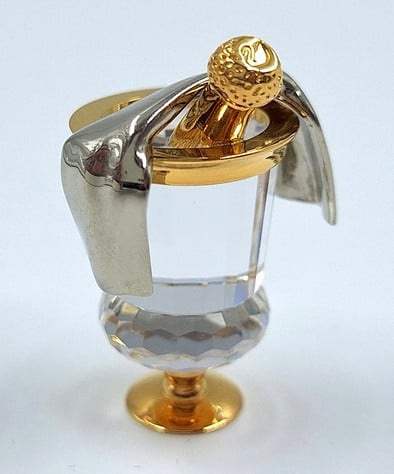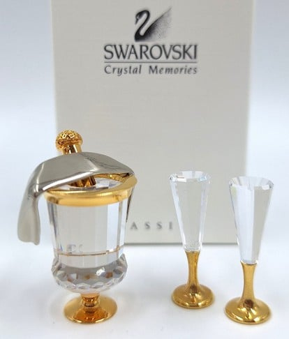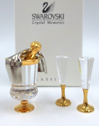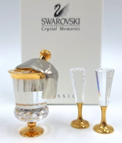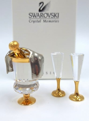 Artikelnummer: G25157Wijnkoeler met 2 glazen van Swarovski, uit de serie 'Memories'. Inclusief doosje, omdoos en certificaat. De fles wordt afgedekt met een zilverkleurige handdoek.