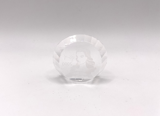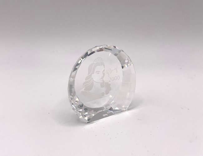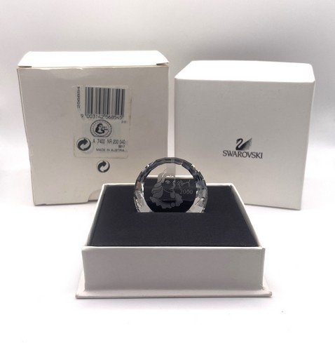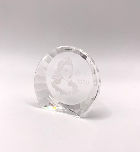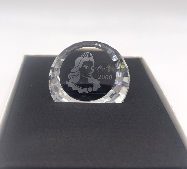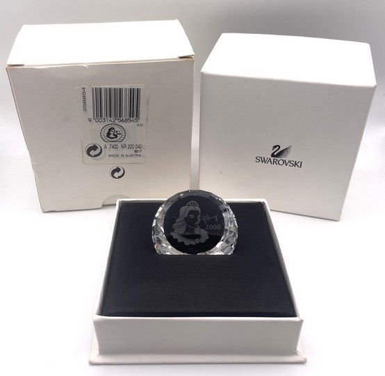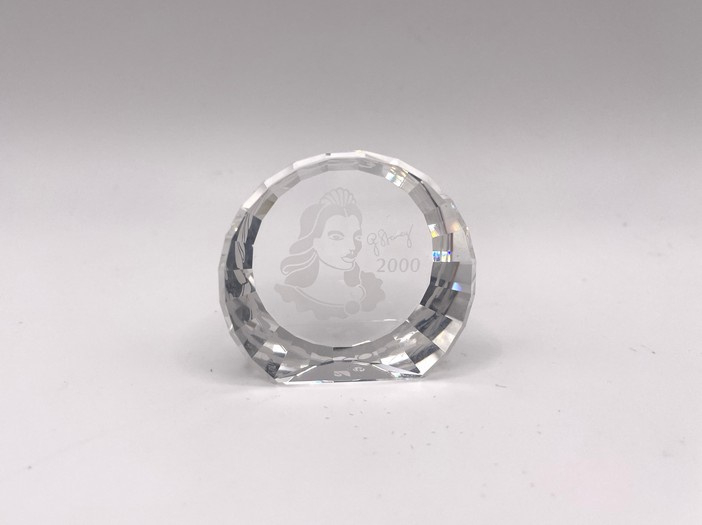 Artikelnummer: 251078In 2000 bracht Swarovski het jaarstuk "Colombine" uit, ontworpen door Gabriele Stamey. Bij het jaarstuk kon ook deze paperweight besteld worden. Op de paperweight is het gezicht van de Colombine afgebeeld, samen met de tekst '2000' en de handtekening door de ontwerper.