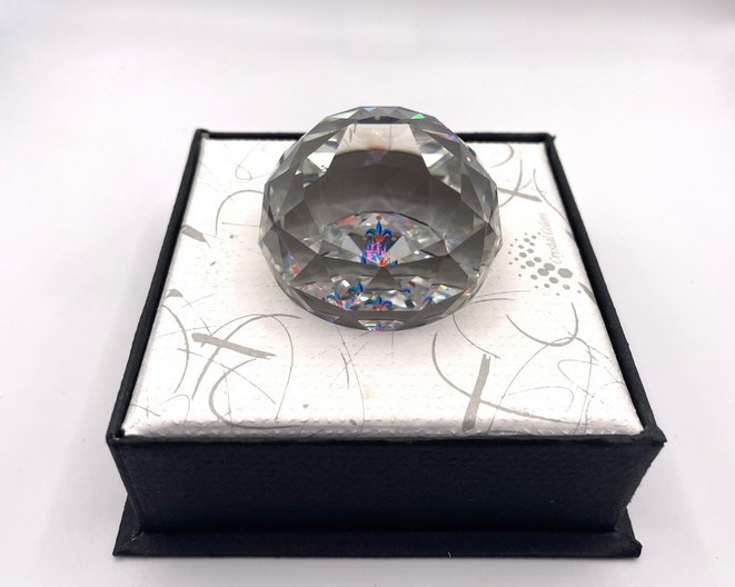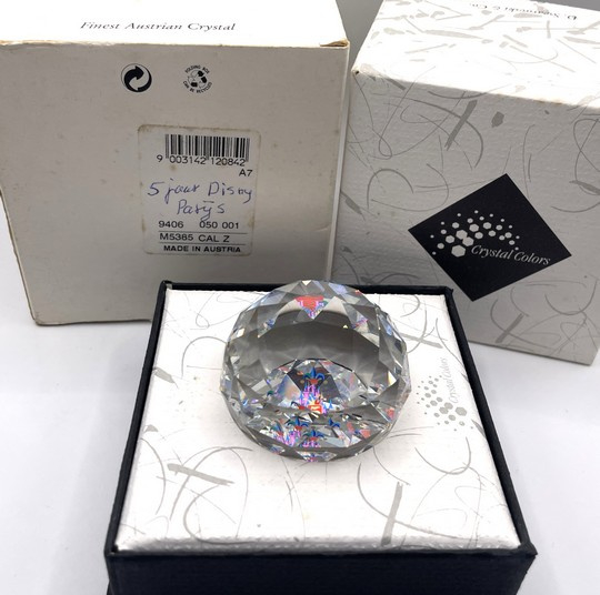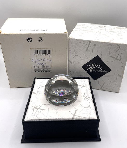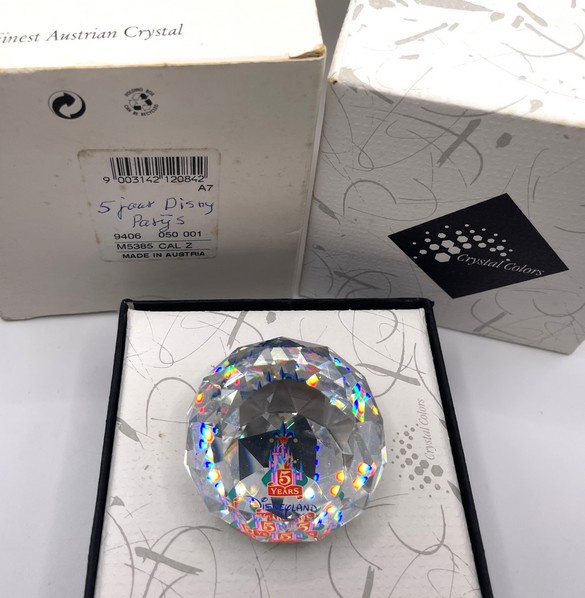 Artikelnummer: 251080Deze bijzondere Swarovski presse-papier werd uitgebracht ter ere van het 5-jarig jubileum van Disneyland Parijs. De paperweight, gemaakt van helder kristal, vangt en weerkaatst het licht op prachtige wijze, terwijl de feestelijke afbeelding van het iconische Disney paleis verwijst naar dit feestelijke moment. Ook is de tekst "5 years Disneyland Paris" te lezen.