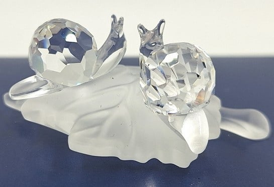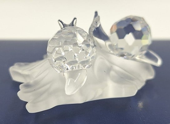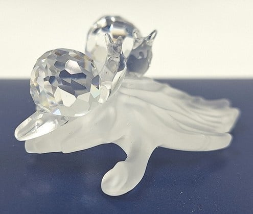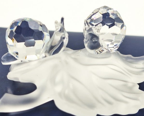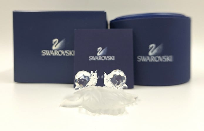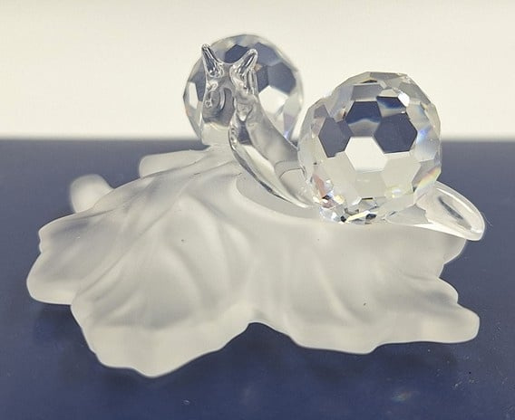 2 kleine Swarovski slakken op een gemateerd blad, inclusief doos en certificaat.