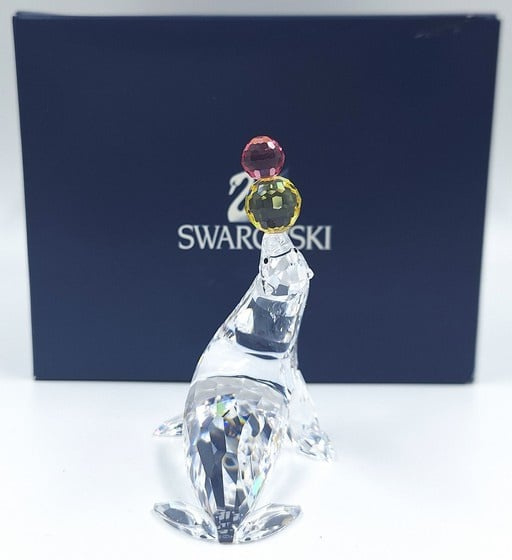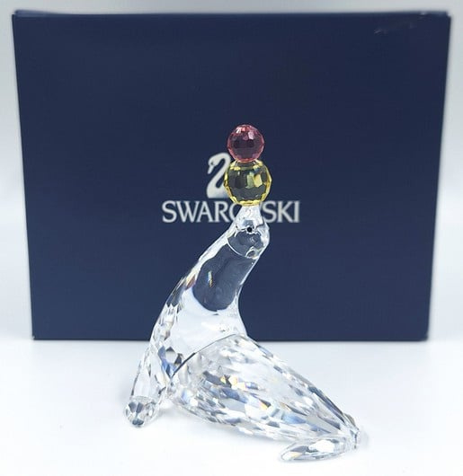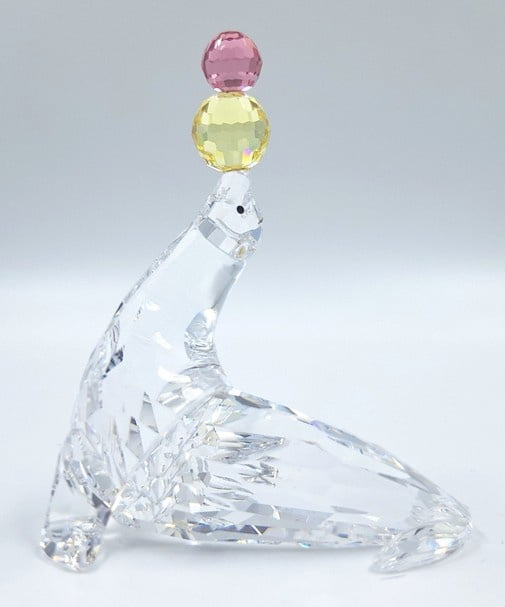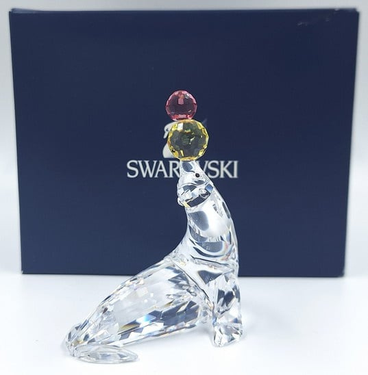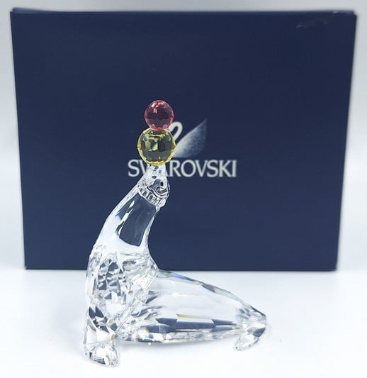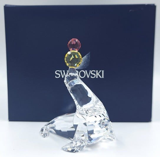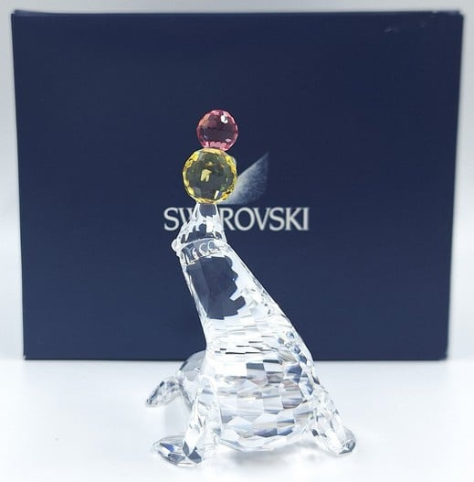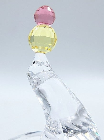 Artikelnummer: G25132Jonglerende/Spelende zeehond van Swarovski, inclusief originele doos, omdoos en certificaat. De zeehond is uitgevoerd in helder kristal en op zijn neus balanseert hij 2 gekleurde ballen (geel en roze).