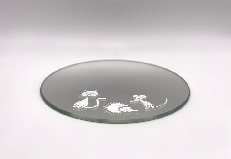Artikelnummer: 251082Swarovski heeft een 'replica set' uitgebracht, bestaande uit een muis, kat en egel (nummer 7606/100/000). Bij deze set hoort dit bijpassende spiegeltje met afbeelding van het katje, egeltje en muisje.