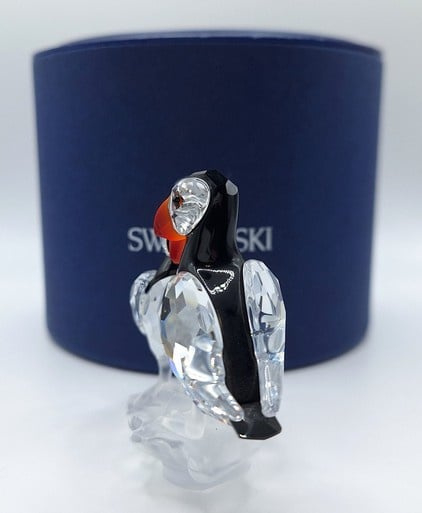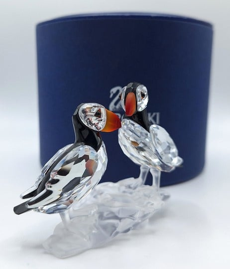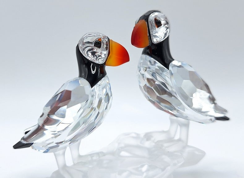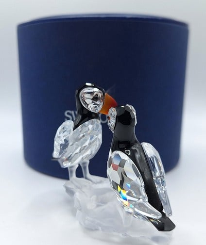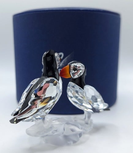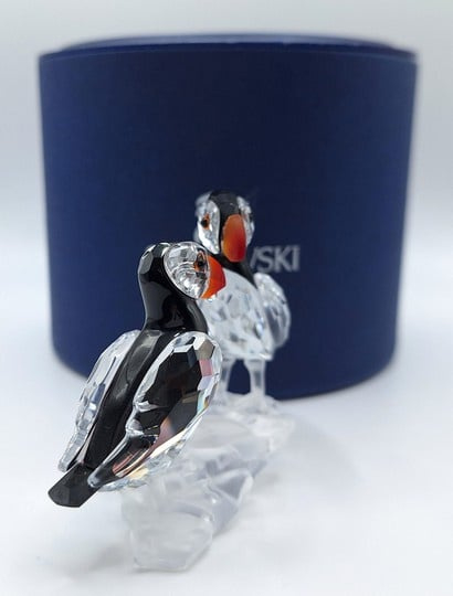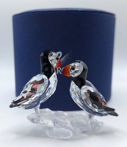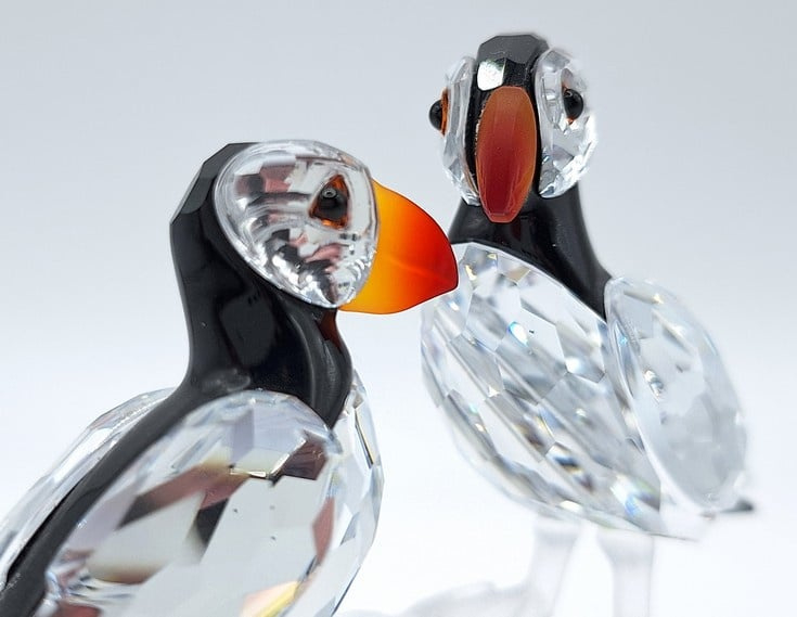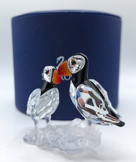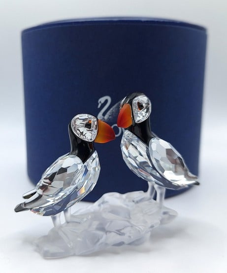 Artikelnummer: G25106Dit paartje papegaaiduikers is prachtig uitgevoerd in helder, gekleurd en gematteerd kristal. De fel oranje snavels vormen een prachtig contrast met het zwarte kristal. Inclusief de originele doos, omdoos en certificaat.