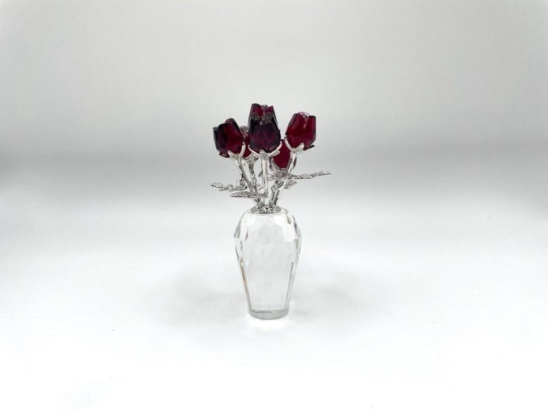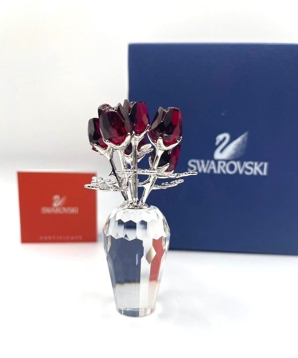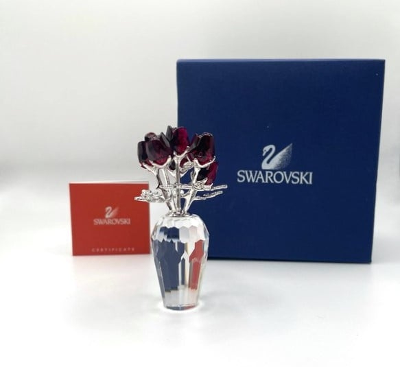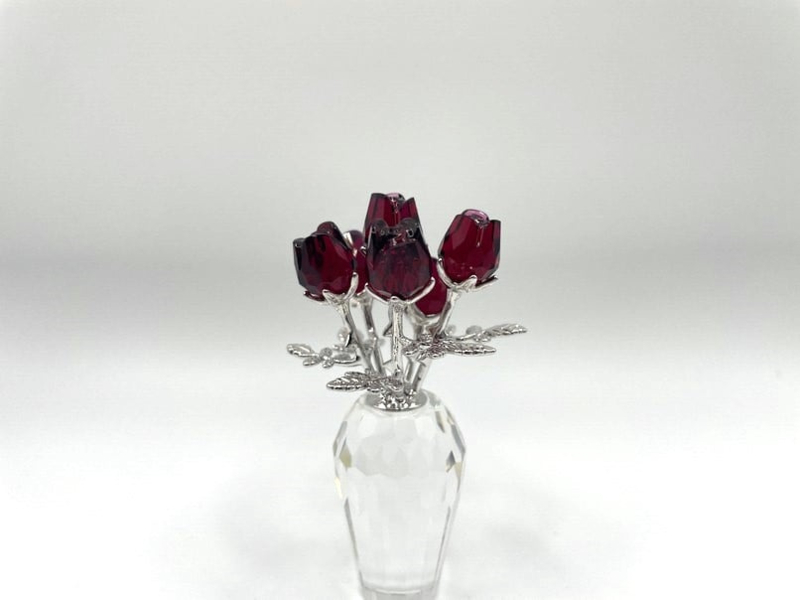 Artikelnummer: G24267Schitterende Swarovski vaas met rode rozen. De bloemblaadjes zijn uitgevoerd in prachtig diep rood kristal, de steeltjes zijn van zilverkleurig metaal en de vaas is gemaakt van kleurloos kristal. Het beeldje zit in de originele doos, inclusief omdoos en certificaat.