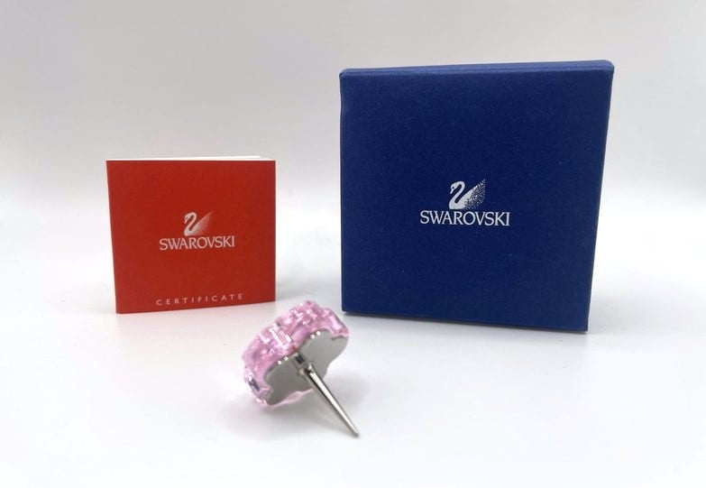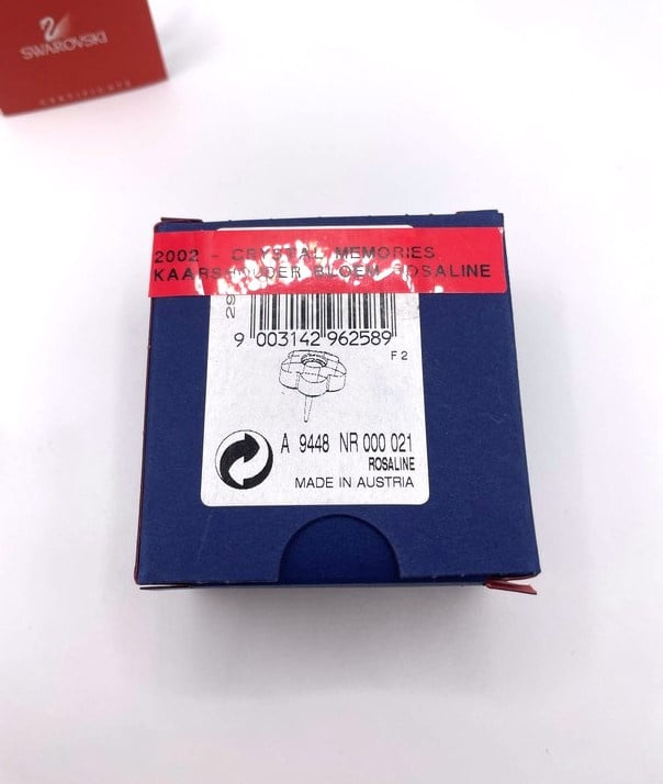 Artikelnummer: G24274Kleine kandelaar van Swarovski, inclusief doosje, omdoosje en certificaat. De kleur is rosaline (roze) en heeft aan de achterkant een pin, waarmee het bijvoorbeeld in een bloemstukje gestoken kan worden. In het midden kan een klein kaarsje geplaatst worden.
