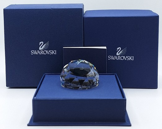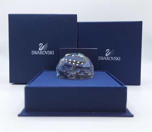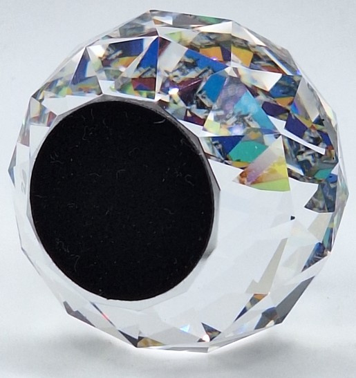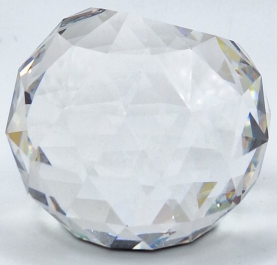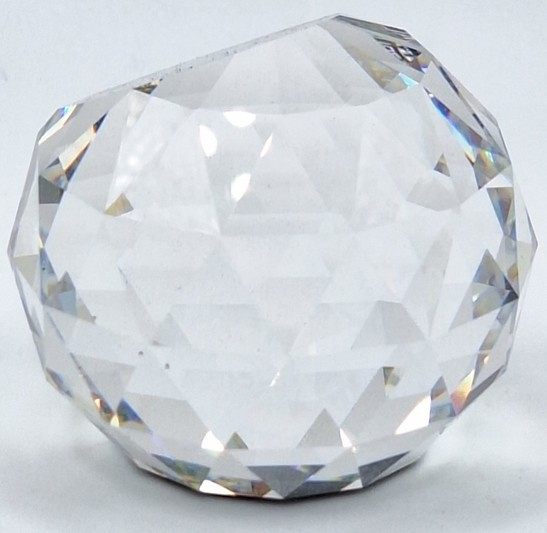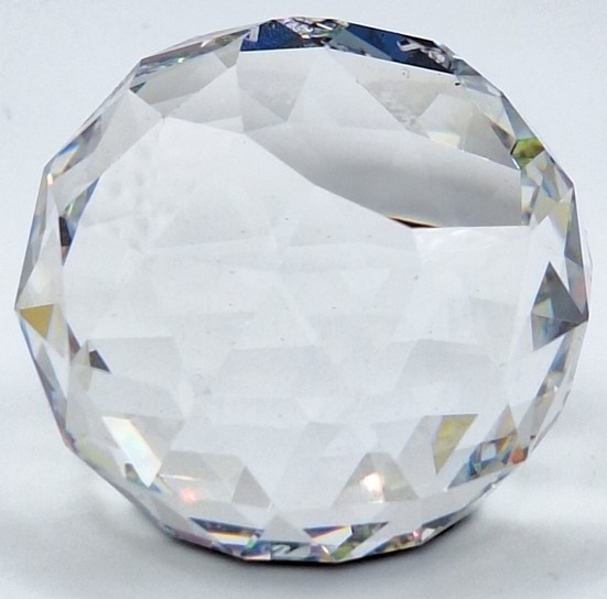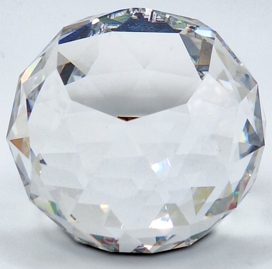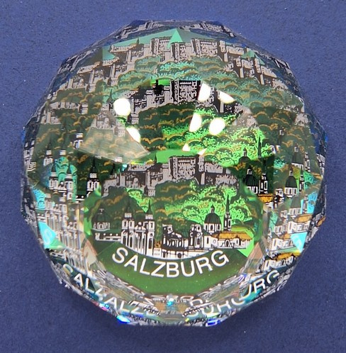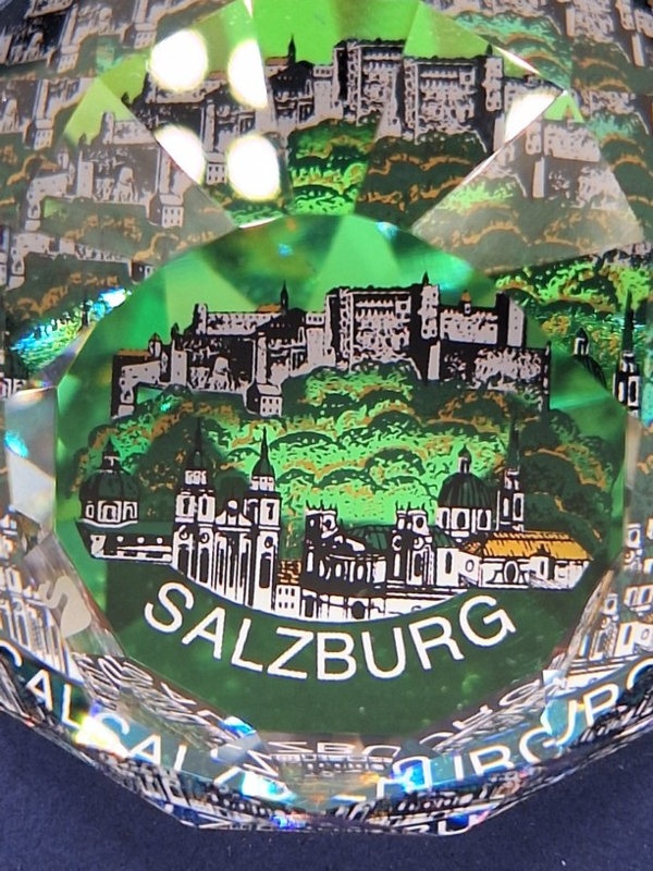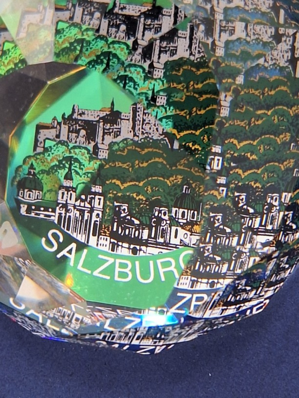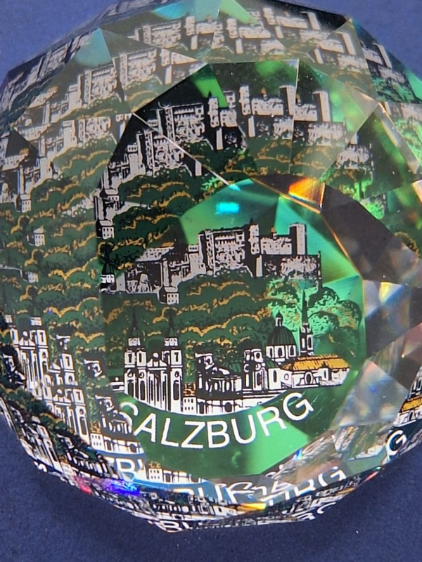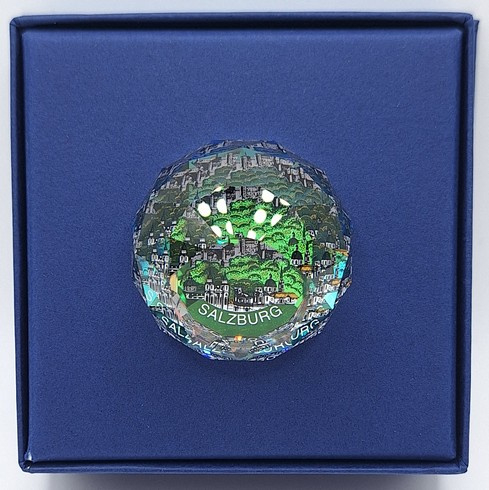 Artikelnummer: 251105Ronde presse papier van Swarovski. De bol toont alle kleuren van de regenboog en op de bodem een afbeelding van het stadsbeeld van Salzburg.