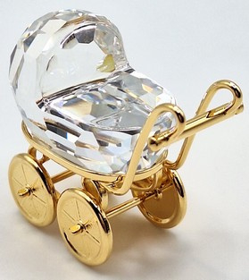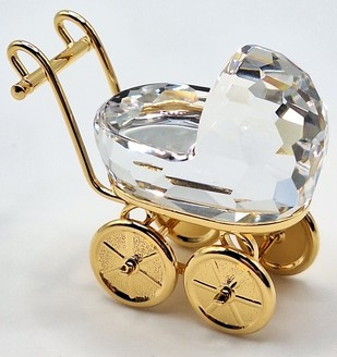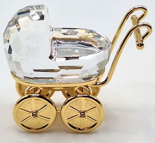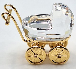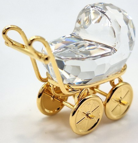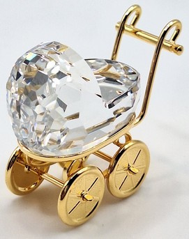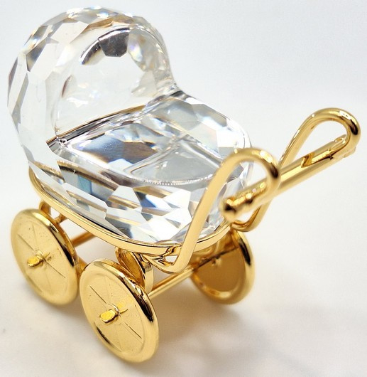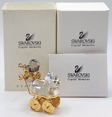 Artikelnummer: 251126Kinderwagen van Swarovski, uit de serie 'Memories', inclusief doosje, omdoosje en certificaat. De kinderwagen is gemaakt van helder kristal en heeft goudkleurig details.