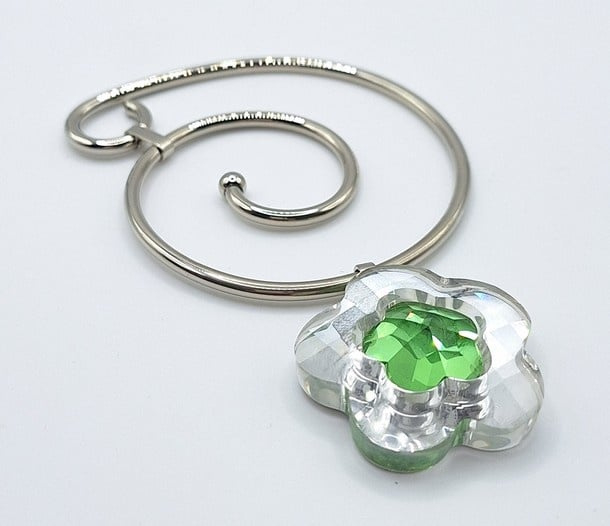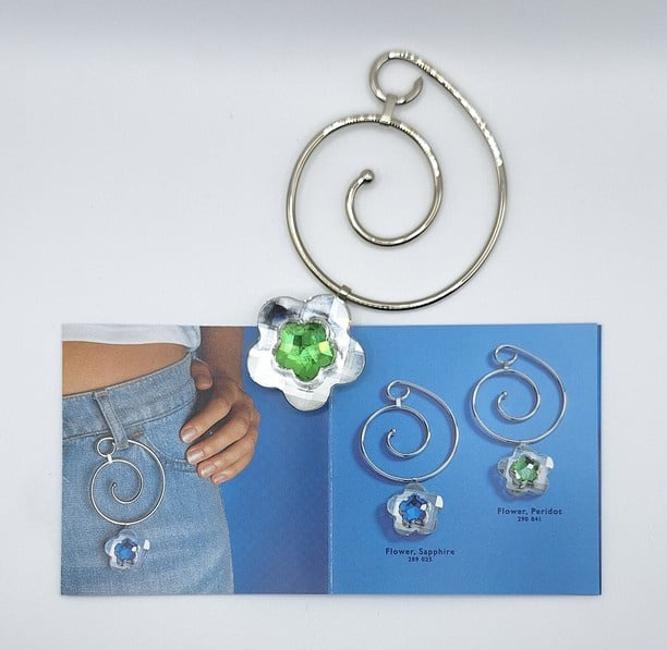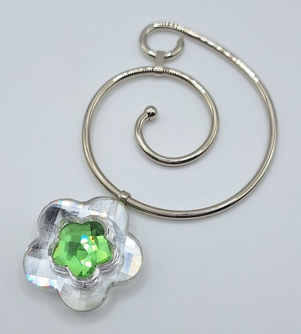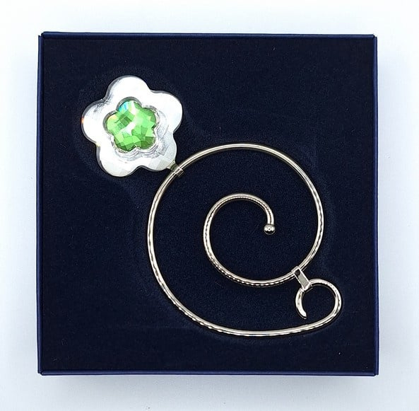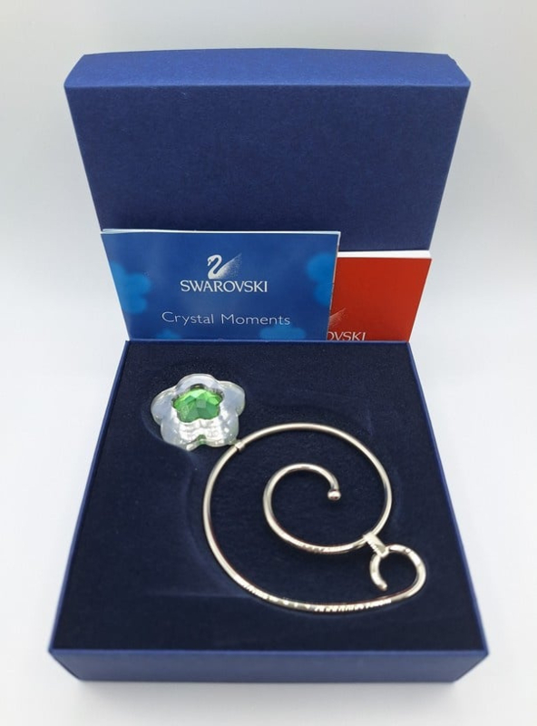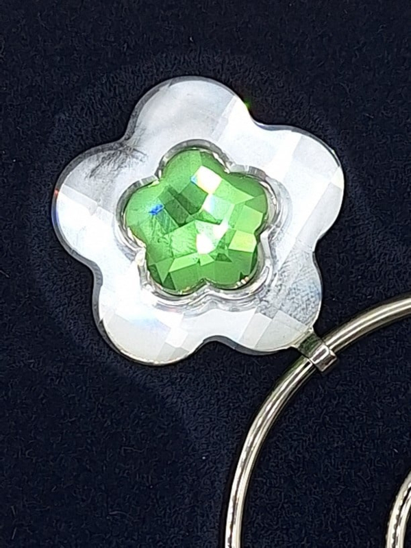 Artikelnummer: G24219Flower peridot van Swarovski, inclusief doos, certificaat en boekje. De hanger is ontworpen om aan een kledingstuk te bevestigen, bijvoorbeeld aan een broek of tas.