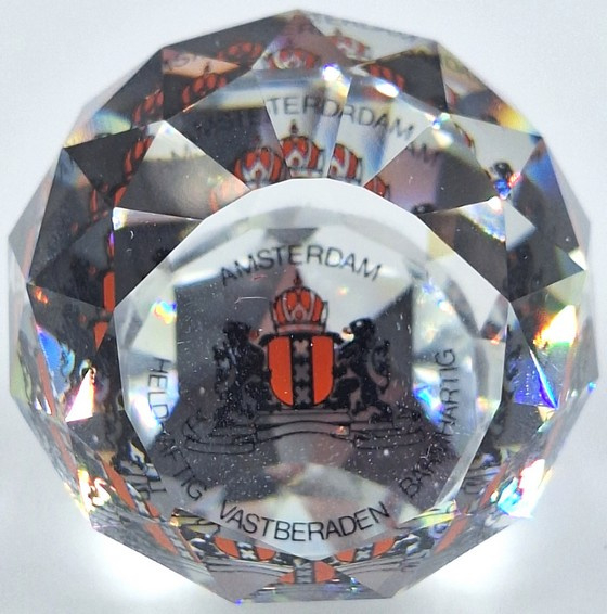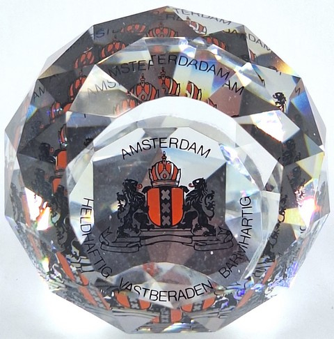 Artikelnummer: 251162Bijzondere presse papier met het stadswapen van Amsterdam. Onder het schild staat het devies "Heldhaftig, Vastberaden, Barmhartig", ter erkenning van het verzet van de Amsterdammers tijdens de Tweede Wereldoorlog.
