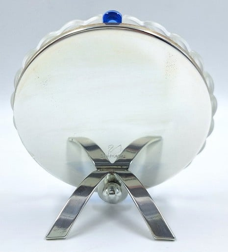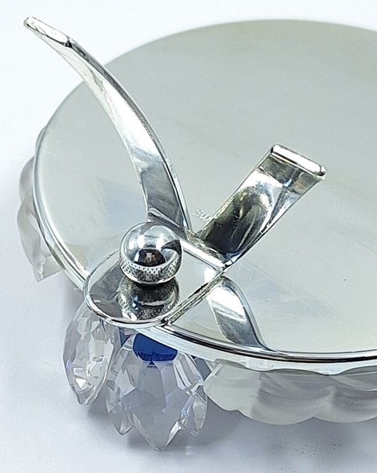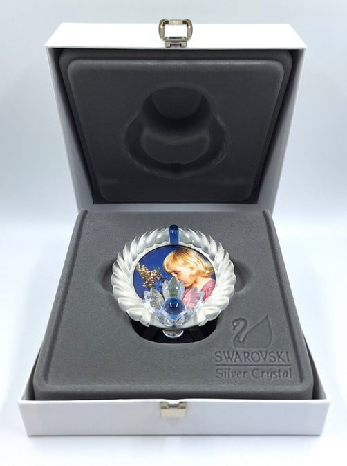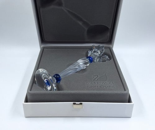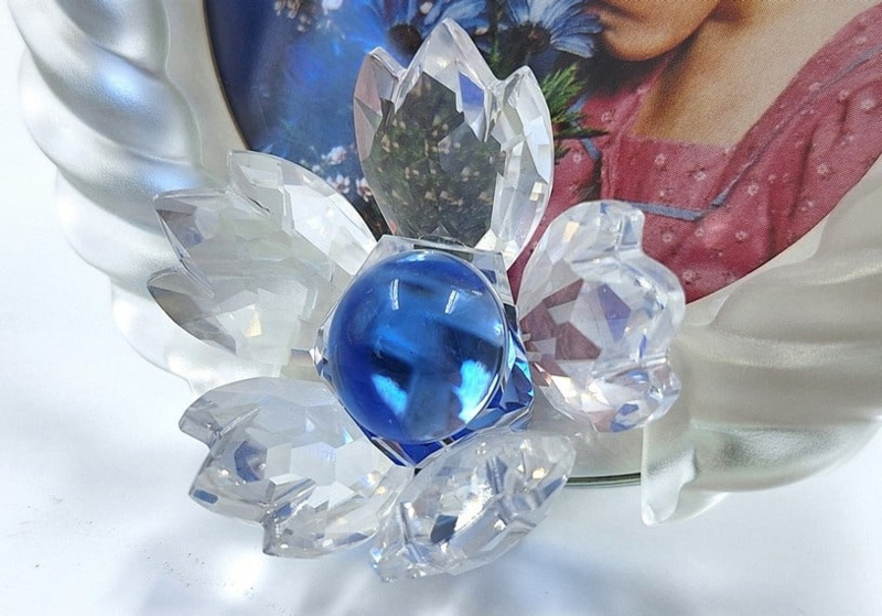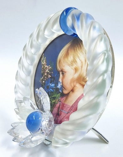 Artikelnummer: G24255Fotolijst van gematteerd kristal met blauwe accenten. Aan de onderkant is het fotolijstje gedecoreerd met een Swarovski bloem met blauwe kern. Fotolijst komt in zijn originele doos, omdoos en certificaat.
