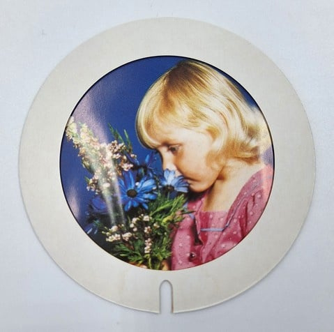- Afmetingen: diameter 9,5 cm, diepte 6 cm. In het lijstje past een foto met een diameter van 9 cm, waarvan een diameter van 6,5 cm binnen de randen valt (zie foto 13 voor een goed beeld).