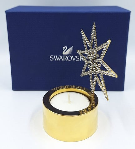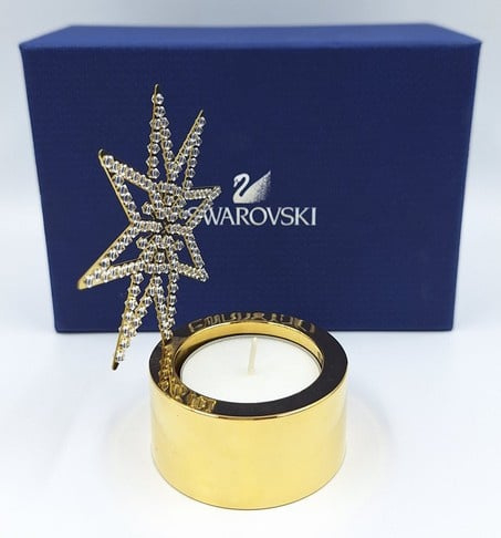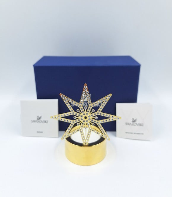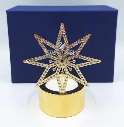 Artikelnummer: G24135Wist je dat Swarovski ook huisaccessoires maakt? Een prachtig voorbeeld is deze theelichthouder met gouden ster. De Swarovski kristallen zijn ín de ster gemonteerd, waardoor de schittering van het theelicht aan beide kanten te zien is.