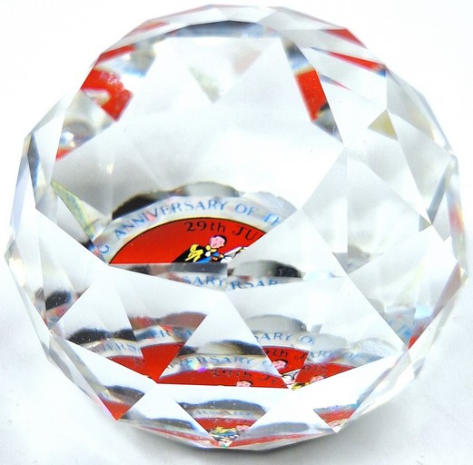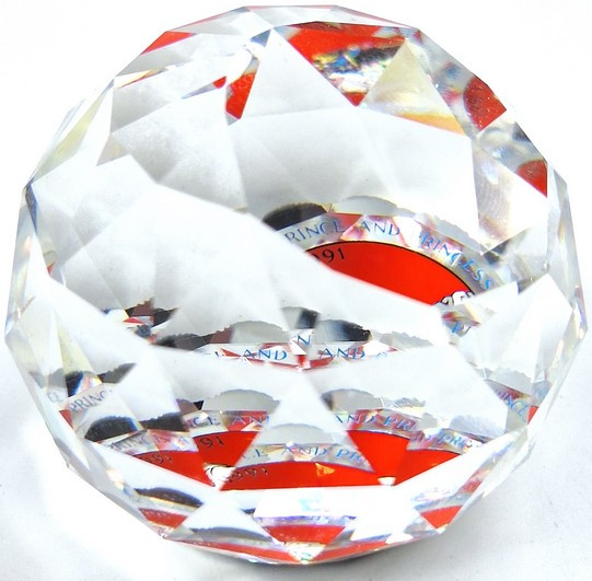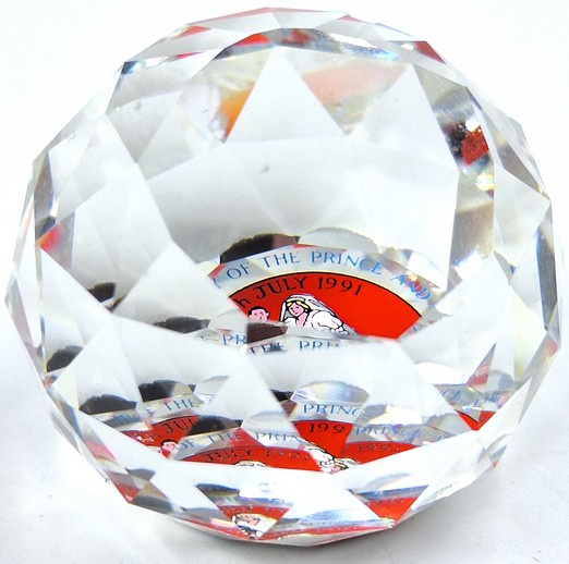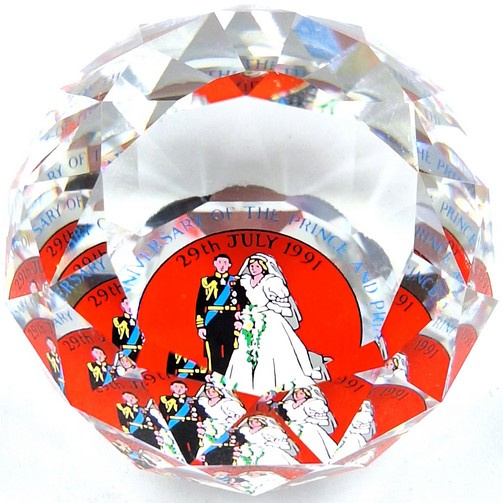 Artikelnummer: 25274Bijzondere presse papier ter ere van het tinnen huwelijk tussen prins Charles en prinses Diana. Op de presse papier staat de tekst 'The 10th wedding anniversary of the Prince and Princess of Wales - 29th July 1991'.