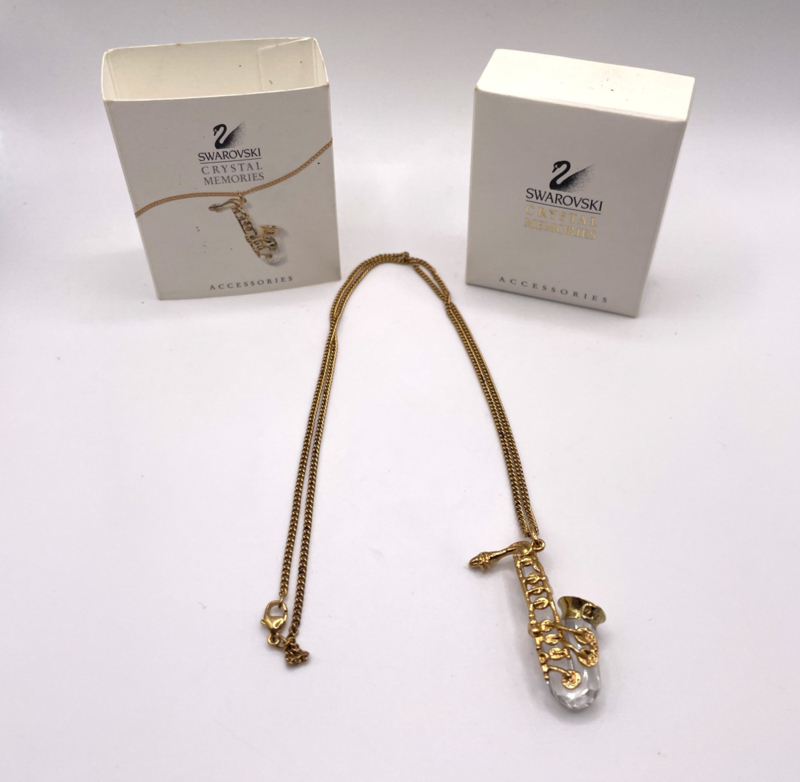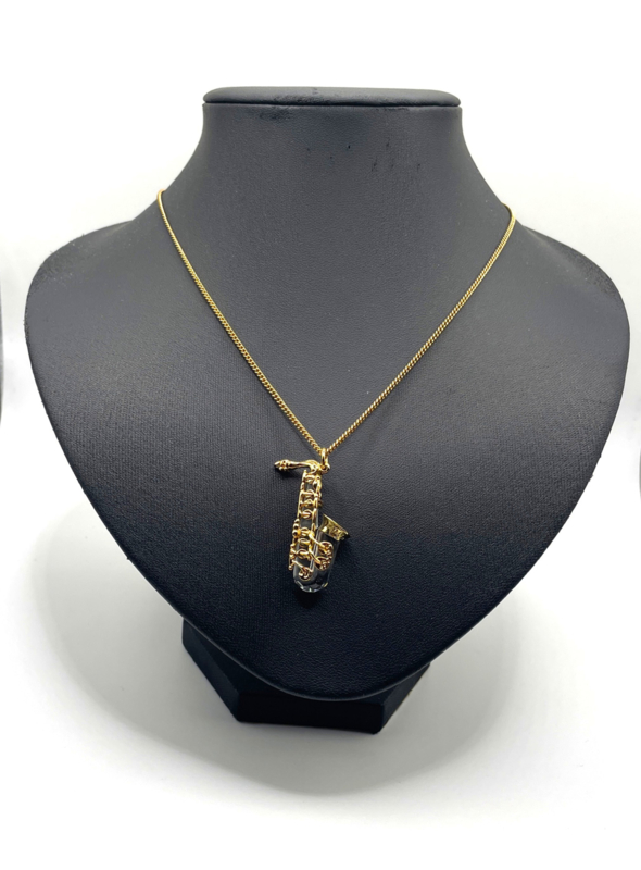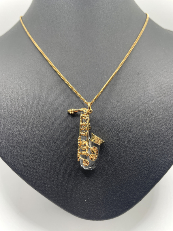 De ketting is goudkleurig en de saxofoon is gemaakt van helder Swarovski kristal met goudkleurige details.