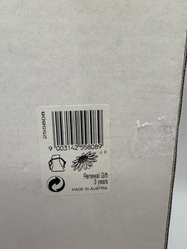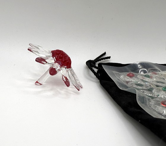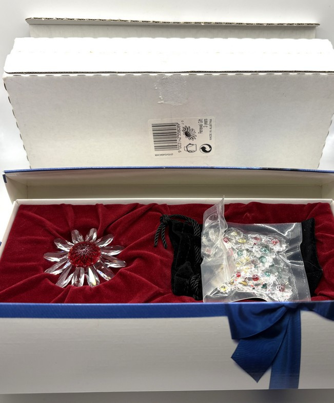 Artikelnummer: 251220Als verzamelaar van Swarovski kun je lid worden van de Swarovski Collectors Society (SCS). Als dank voor je lidmaatschap ontvang je elk jaar een geschenk van Swarovski. Het geschenk wisselt steeds. In 1999, 2000 en 2001 ontving je een margriet in verschillende kleuren. In 2000 was dat een rode margriet. Als het ook nog eens je driejarige jubileum van lidmaatschap was, ontving je er ook nog een zakje kleine margrietjes bij in een velvet zakje.