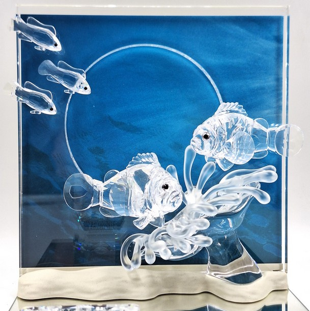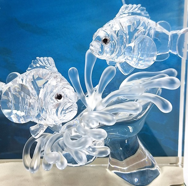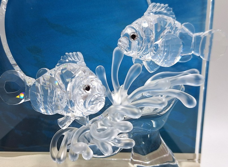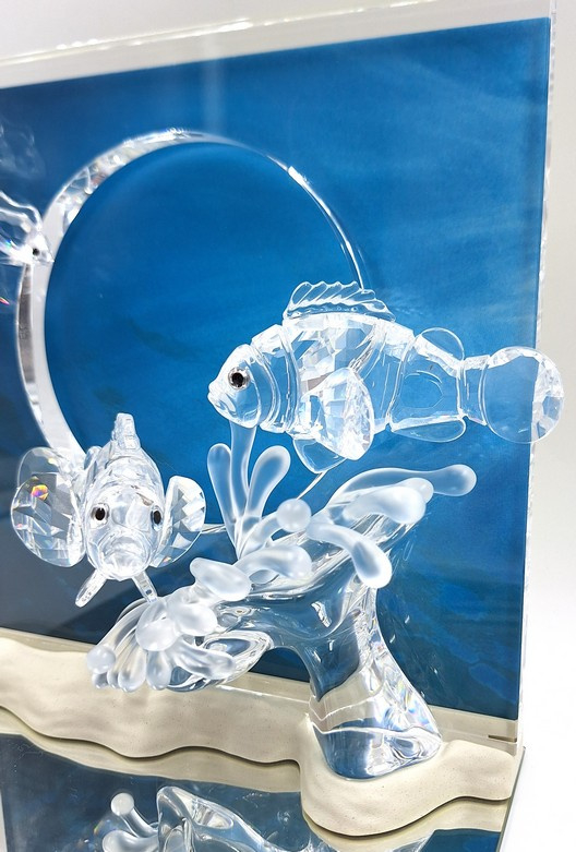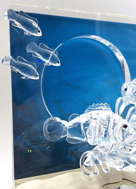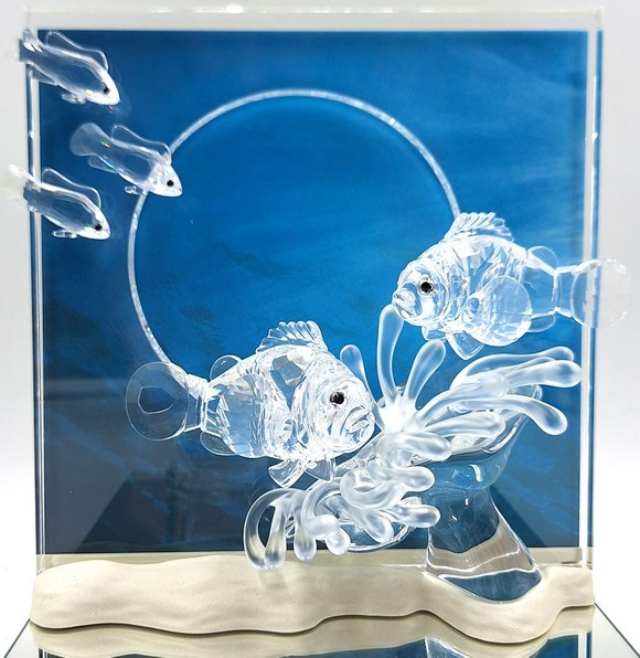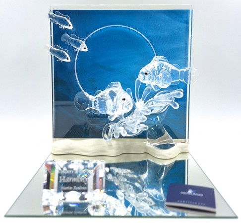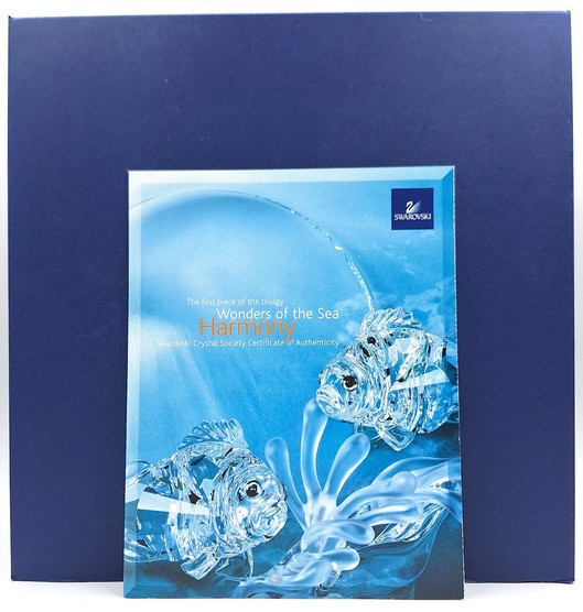 Artikelnummer: 261019Prachtig Swarovski jaarstuk uit 2005: Harmony, Wonders of the sea op display. Er wordt een achtergrond bijgeleverd en een spiegel met hetzelfde formaat. Je kunt dus kiezen welke achtergrond je wilt. Het gaat om de heldere uitgave. Inclusief originele doos, omdoos en certificaat. Komt met spiegel en bijbehorende plaquette (inclusief doosje en certificaat).