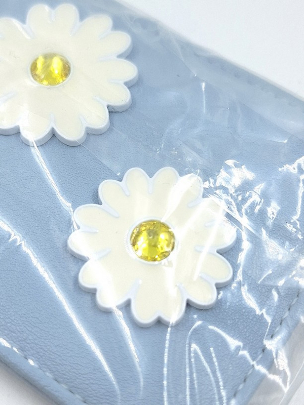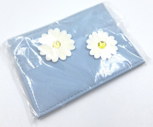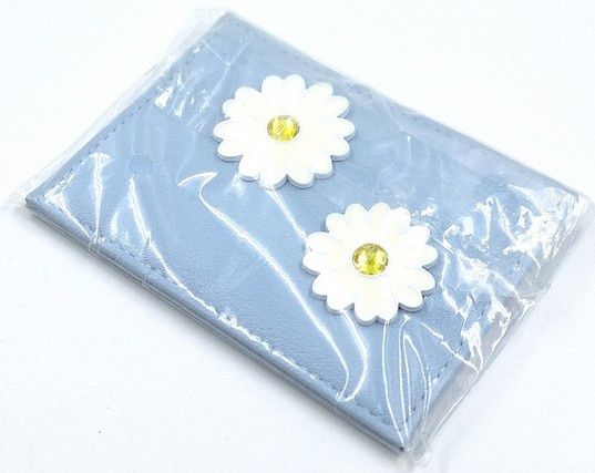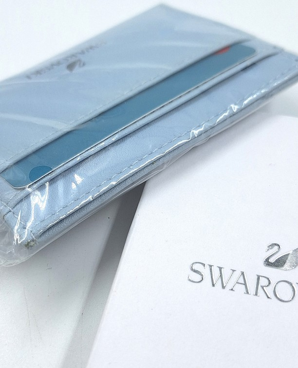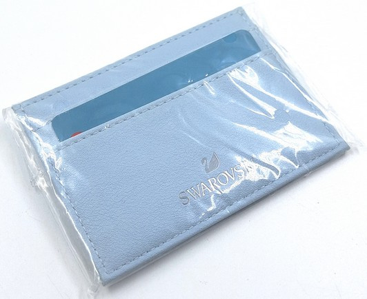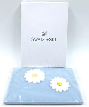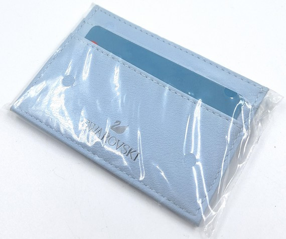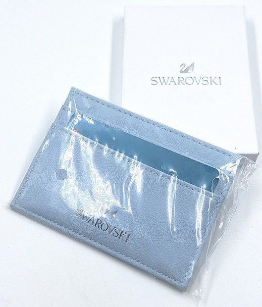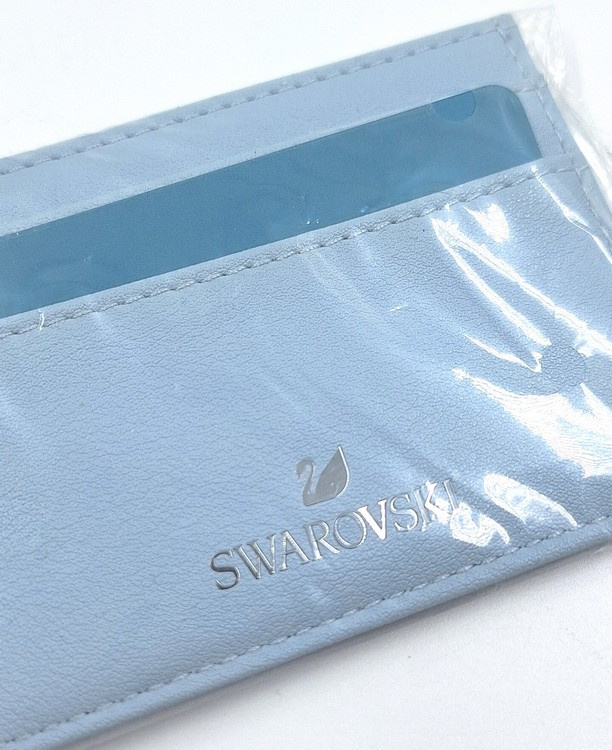 Leuke kaarthouder van Swarovski. De lichtblauwe kaarthouder zit nog in de originele ongeopende plastic verpakking. Het is gedecoreerd met twee witte bloemetjes en komt met het originele doosje.