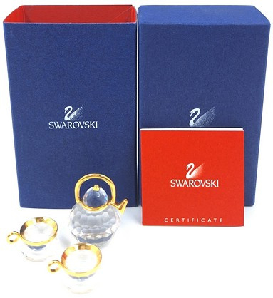 Artikelnummer: 261048Theepot met 2 kopjes van Swarovski. Het beeldje is gemaakt van helder kristal met gouden accenten. Inclusief origineel doosje, omdoosje en certificaat.